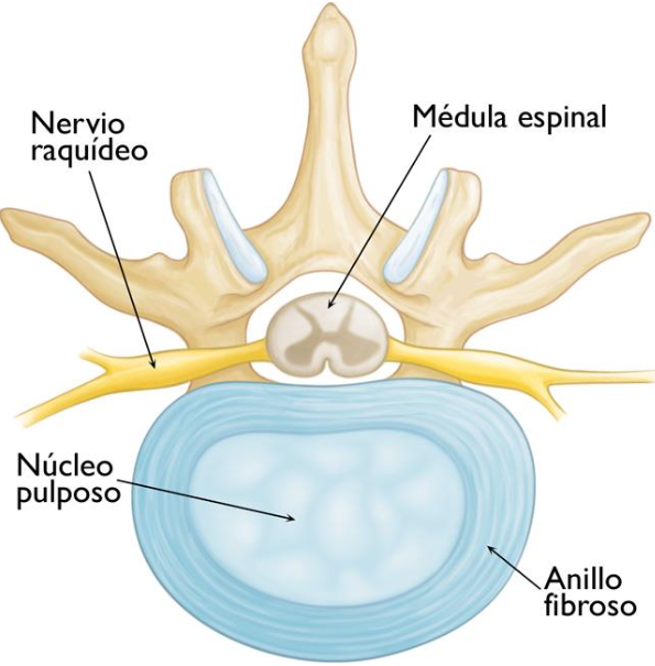 La Columna Vertebral está formada por Vértebras, y para que no rocen entre sí y se desgasten, entre ellas hay una estructura blandita que se llama Disco Intervertebral que actúa como amortiguador. El Disco Intervertebral tiene una capa externa que se llama Anillo Fibroso, que es una capa cartilaginosa que le da estabilidad, y por dentro tiene el Núcleo Pulposo.