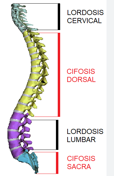 Si miramos la Columna Vertebral desde detrás, en condiciones de Espalda Sana (tal y como se ve en la imagen de arriba), vemos las Vértebras alineadas, una encima de otra, separadas por los Discos Intervertebrales. Ahora bien, si la miramos desde un lateral, vamos a ver que no está recta, hay 3 curvas (al menos, en condiciones de Espalda Sana). Así, diremos que la Columna Cervical y la Columna Lumbar están en Lordosis y la Columna Dorsal y el Sacro están en Cifosis. Esto es normal.