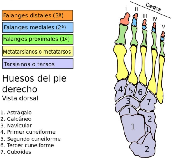 Empezamos con el repaso anatómico. Como ya os he contado más veces, en cada pie tenemos, nada más y nada menos que 26 huesos. Empezando por la parte de atrás, tenemos los huesos del Tarso (Astrágalo, Calcáneo, Navicular, Primer, Segundo y Tercer Cuneiforme y Cuboides), después, seguimos con el Metatarso, que está compuesto por 5 huesos, uno por cada dedo. Y a esto, finalmente, le siguen las Falanges de los dedos. En este caso, tenemos 3 en cada dedo, menos en el primero, que solo tenemos 2.