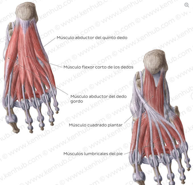 En el caso del paquete muscular de los pies, tenemos 19 músculos en cada uno de ellos. Podemos dividirlos en Músculos Dorsales (Extensor Corto de los Dedos, Extensor Corto del Dedo Gordo e Interóseos Dorsales) y Músculos Plantares (Abductor del Dedo Gordo, Flexor Corto de los Dedos, Abductor del Quinto Dedo, Cuadrado Plantar, Lumbricales, Flexor Corto del Dedo Gordo, Aductor del Dedo Gordo, Flexor Corto del Quinto Dedo, Oponente del Quinto Dedo, Interóseos Plantares). Pero no vamos a entrar más en detalle, os dejo una imagen a continuación.
